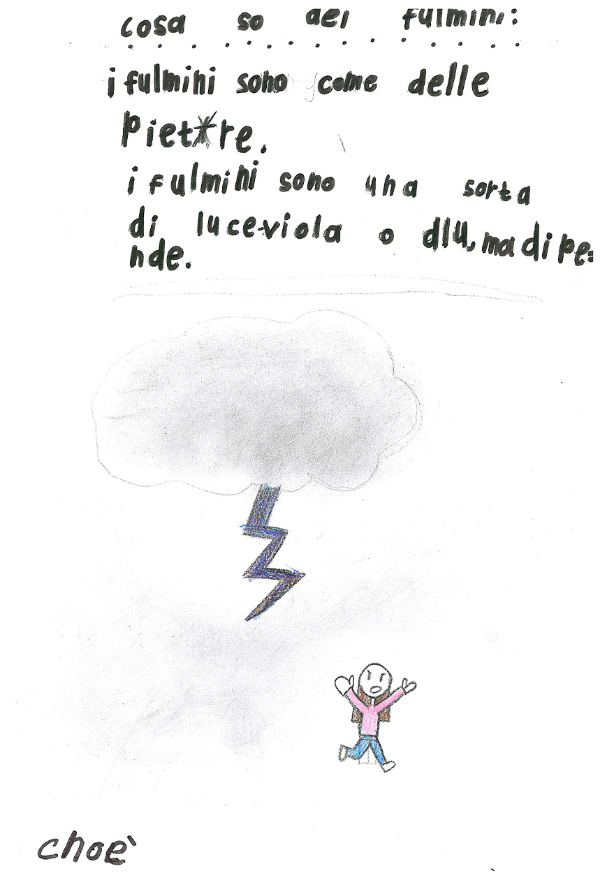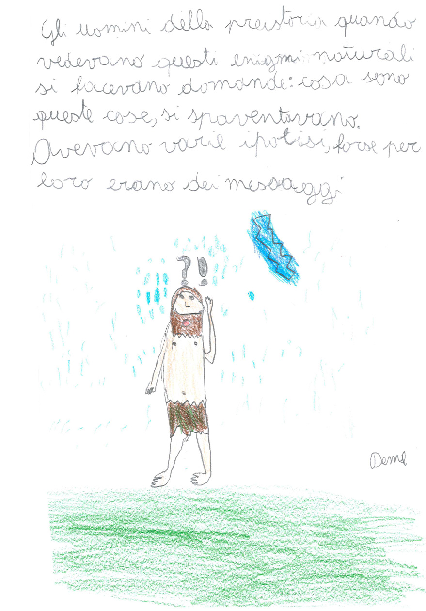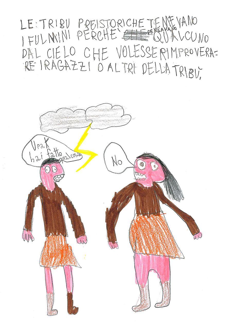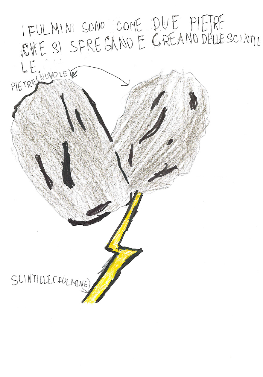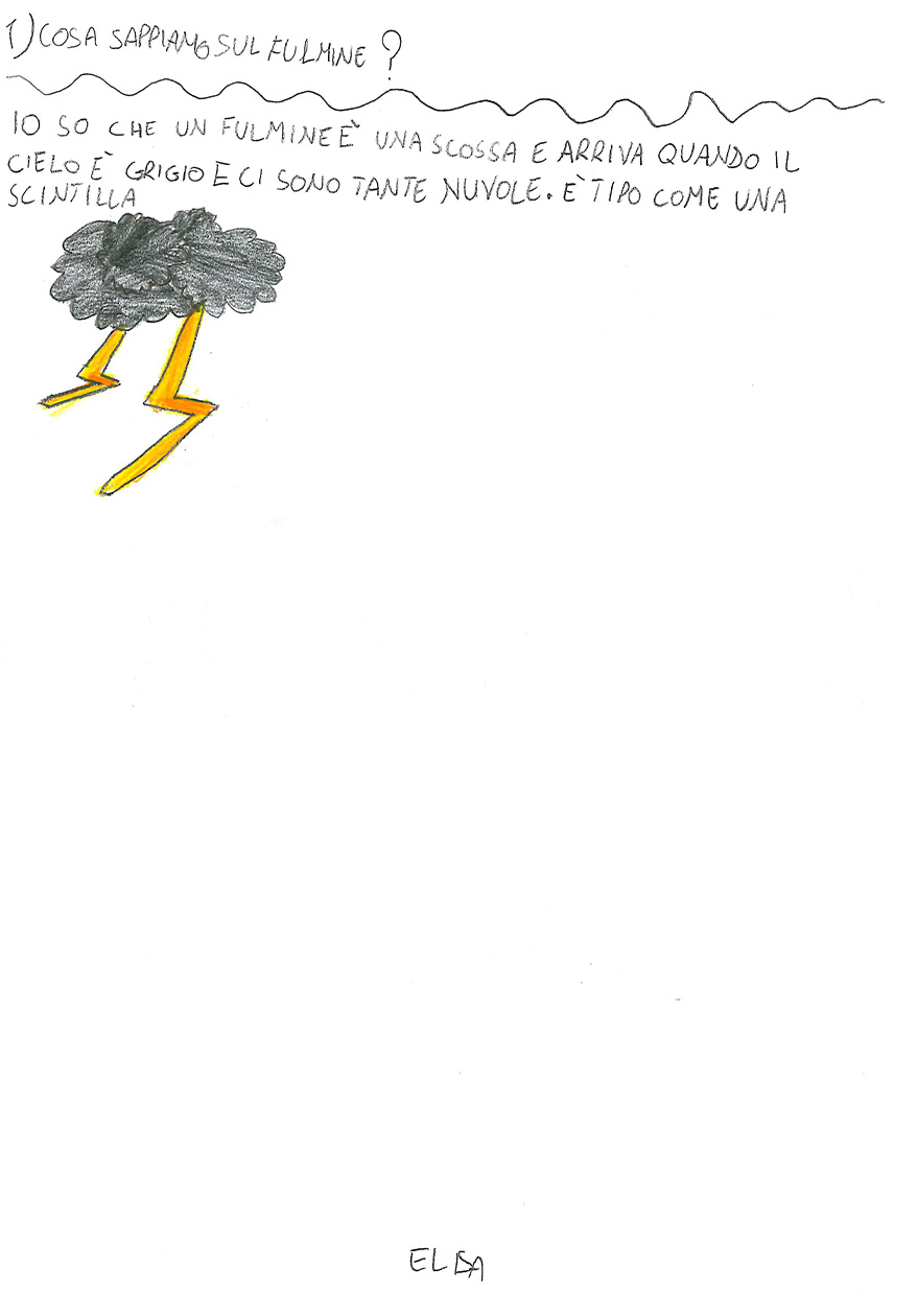 “Cosa sai del fulmine? Prova a spiegare con un disegno e un testo che cos’è il fulmine” “Immagina anche di essere un giovane Sapiens fossile che trova riparo nella sua caverna. Secondo te, cosa pensava che fosse il fulmine?”
