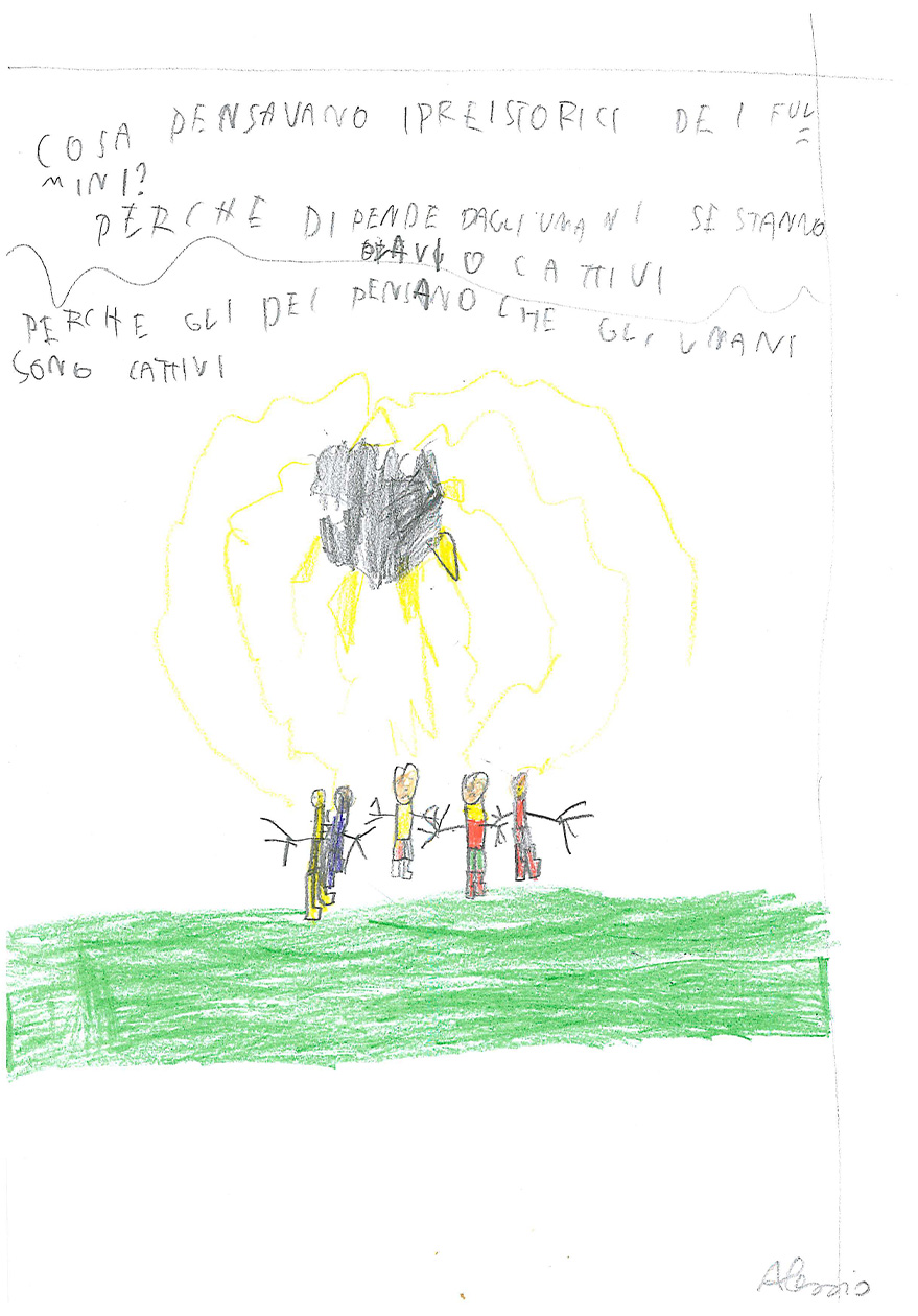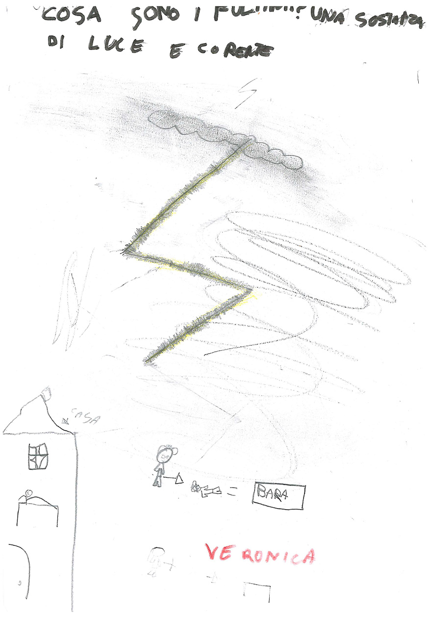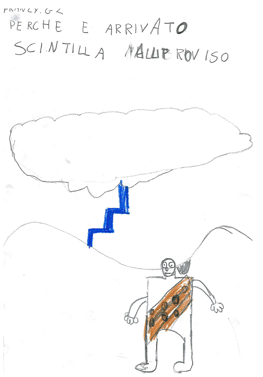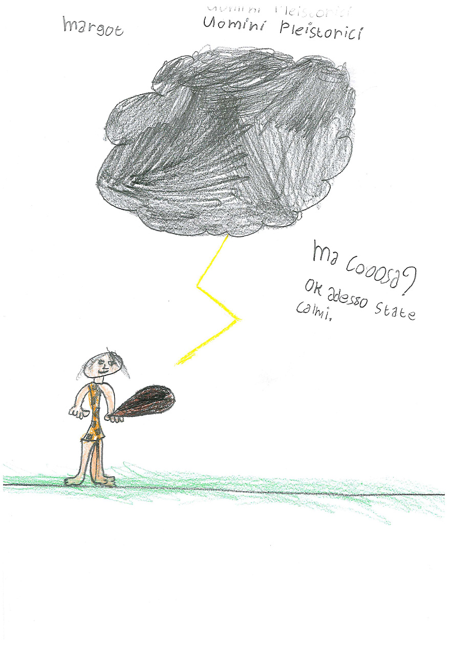 “Cosa sai del fulmine? Prova a spiegare con un disegno e un testo che cos’è il fulmine” “Immagina anche di essere un giovane Sapiens fossile che trova riparo nella sua caverna. Secondo te, cosa pensava che fosse il fulmine?”
