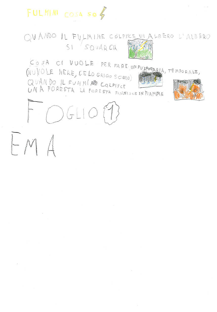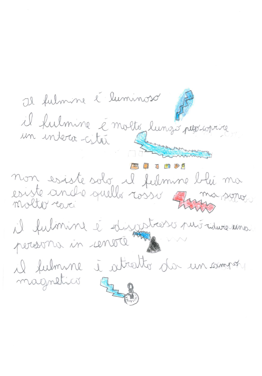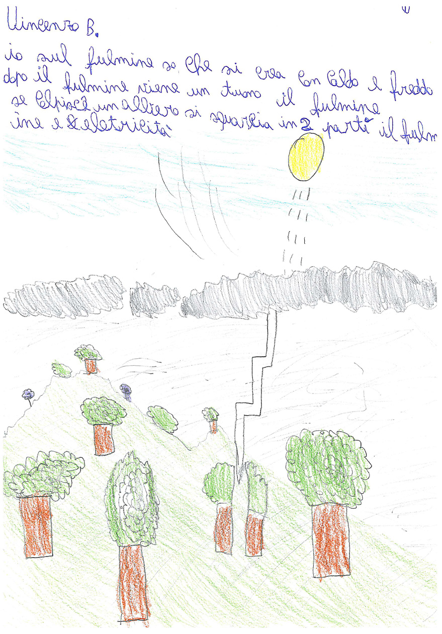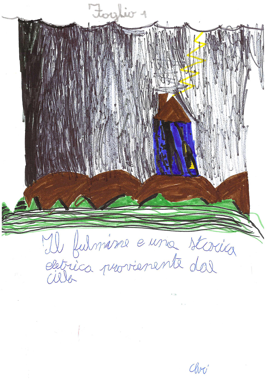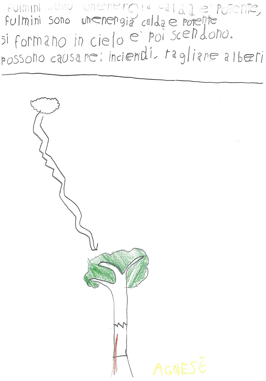 La classe 3 A della scuola primaria Anna Frank è composta da 20 alunni/e molto motivati al lavoro cooperativo. La programmazione segue i loro interessi e si discosta fortemente dalle proposte contenutistiche dei testi Ministeriali, perché i bambini e le bambine sono protagonisti del proprio sapere e scelgono insieme agli insegnanti il percorso da seguire. Il lavoro inserito in piattaforma è un esempio di questa modalità Cooperativa: nel primo pomeriggio di una bella giornata primaverile, mentre nel cortile della scuola era in corso la ricreazione, l’annuvolamento improvviso del cielo convinse le classi a rientrare, ma la Terza A chiese alla maestra di fermarsi ad osservare l’approssimarsi del temporale. Un momento dopo, un fulmine squarciò il cielo con un bagliore crepitante e lo schianto di un tuono impressionante.