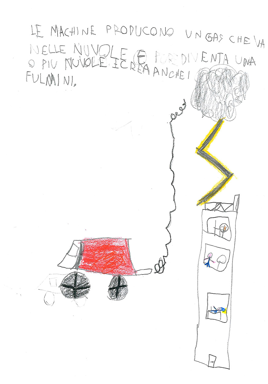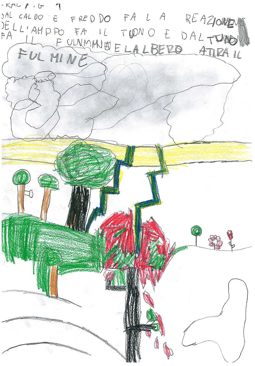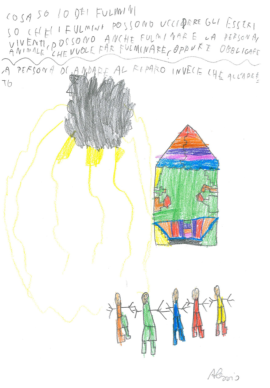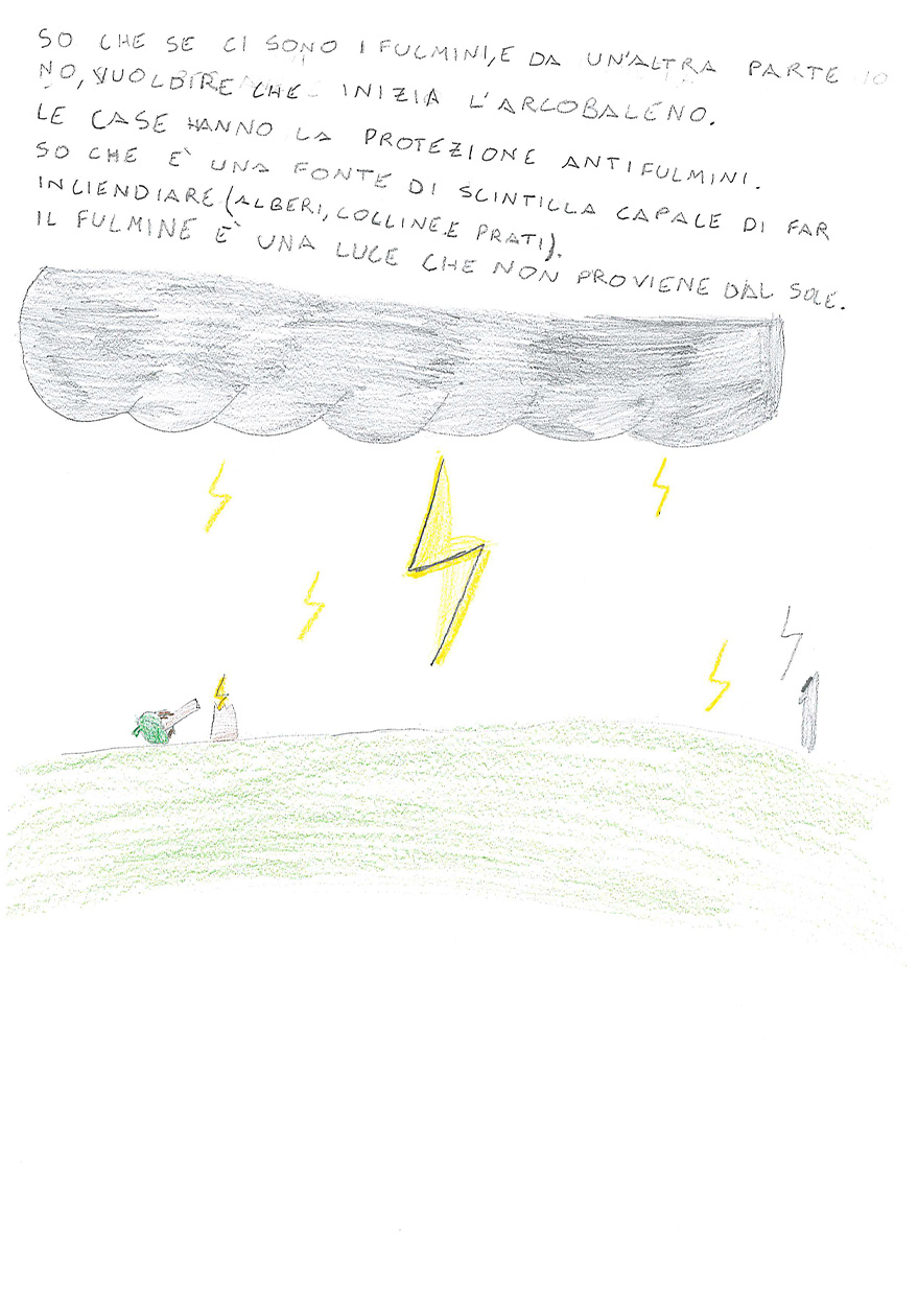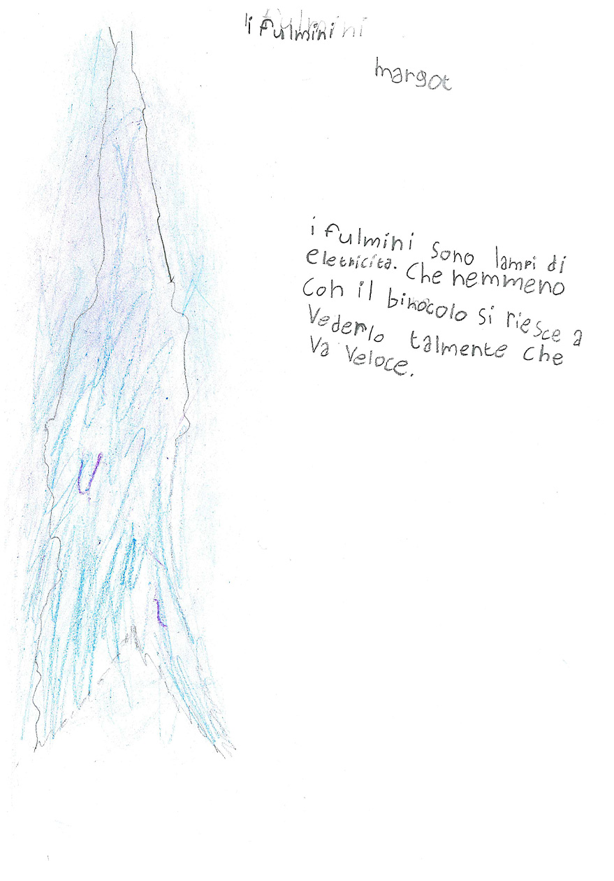 La classe 3 A della scuola primaria Anna Frank è composta da 20 alunni/e molto motivati al lavoro cooperativo. La programmazione segue i loro interessi e si discosta fortemente dalle proposte contenutistiche dei testi Ministeriali, perché i bambini e le bambine sono protagonisti del proprio sapere e scelgono insieme agli insegnanti il percorso da seguire. Il lavoro inserito in piattaforma è un esempio di questa modalità Cooperativa: nel primo pomeriggio di una bella giornata primaverile, mentre nel cortile della scuola era in corso la ricreazione, l’annuvolamento improvviso del cielo convinse le classi a rientrare, ma la Terza A chiese alla maestra di fermarsi ad osservare l’approssimarsi del temporale. Un momento dopo, un fulmine squarciò il cielo con un bagliore crepitante e lo schianto di un tuono impressionante.